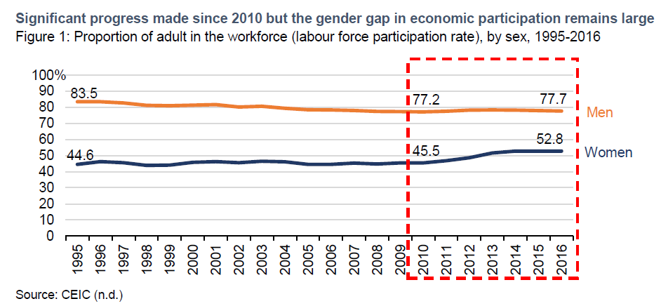 The improvement in the past six years is particularly impressive. While the proportion of adult men in the workforce remained somewhat stable from 2010 to 2016, the increase in proportion of adult women entering the workforce in that time period was eight times more than the increase recorded in 14 years prior to that.