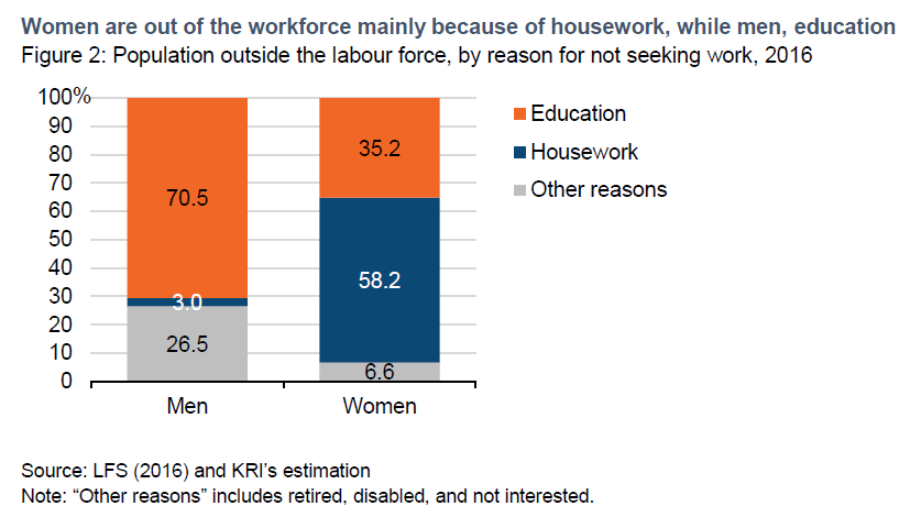 The rise of independent work being a significant factor behind the improvement in women entering the workforce speaks volumes on one of the most important underlying reasons that hinder women from participating meaningfully in the economy – the struggle that women face in balancing work and care responsibilities. In 2016, 60% or 2.6 million Malaysian women did not join the workforce due to housework, compared to only 3% or 64,000 men. By contrast, the most common reason keeping men out of work was education (Figure 2). The flexibility inherent in independent work provides greater freedom for women to juggle both paid work and housework.