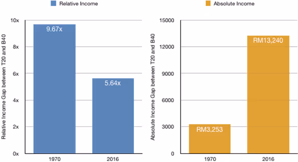 To illustrate this point, consider that in 1970, the average income for Malaysian households in the top 20 percent of the income distribution (the T20) was about 10 times higher than households in the bottom 40 percent of the income distribution (the B40). In 2016, the relative gap narrowed: the average T20 income is now less than 6 times that of the B40. However, the absolute gap shows a striking contrast. Adjusted for inflation, the average T20 household went from earning roughly RM3,300 more than the average B40 household in 1970 to earning 13,200 more in 2016. If public perception is shaped by absolute income more than relative income, then this can help explain the mismatch between conventional measures and public perception.