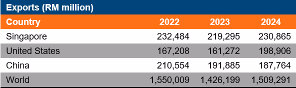 Table 1: Malaysia exports, top three partners, 2022-2024