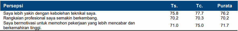 Keyakinan terhadap kemahiran teknikal mereka serta peluasan rangkaian profesional melalui pengiktirafan profesional juga dilihat dalam tanggapan mereka mengenai jenis pekerjaan yang mereka yakin untuk mohon. Dalam kalangan Teknologis Profesional dan Juruteknik Bertauliah, mereka berpendapat bahawa pengiktirafan profesional mendorong mereka untuk memohon peranan yang lebih mencabar (masing-masing 71.0 dan 75.0). Hubungan ini lebih ketara dalam kalangan Teknologis Berijazah dan Juruteknik Berkelayakan, di mana kedua-dua kumpulan menyatakan persepsi tinggi bahawa mereka lebih bermotivasi untuk mengejar pekerjaan berkemahiran tinggi. Ini menunjukkan bahawa pengiktirafan bukan sahaja mengesahkan keupayaan teknikal tetapi juga memupuk aspirasi kerjaya yang lebih progresif.