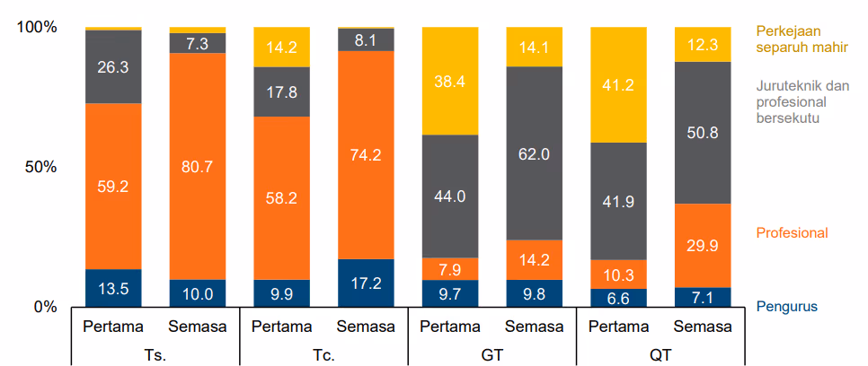 Analisis status pekerjaan mengikut peringkat kerjaya turut menyokong corak perkembangan ini (Rajah 2). Walaupun kebanyakan individu pada awalnya memasuki tenaga kerja dalam peranan separa mahir atau berkemahiran rendah, terutamanya dalam kalangan Teknologis Berijazah (GT) dan Juruteknik Berkelayakan (QT), terdapat peralihan yang jelas ke arah peranan profesional dalam pekerjaan mereka sekarang. Sebagai contoh, perkadaran profesional dalam kalangan Teknologis Berijazah (GT) meningkat daripada 44.0% dalam pekerjaan pertama mereka kepada 62.0% pada masa kini, manakala perkadaran Juruteknik Berkelayakan (QT) dalam pekerjaan separa mahir menunjukkan penurunan yang ketara.