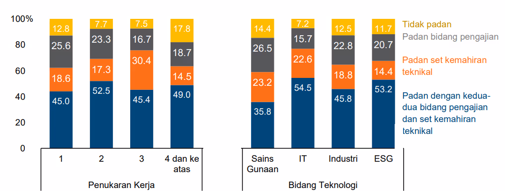 Rajah 3: Penilaian padanan pekerjaan semasa dengan bidang pengajian atau set kemahiran teknikal, berdasarkan jumlah penukaran kerja dan bidang teknologi