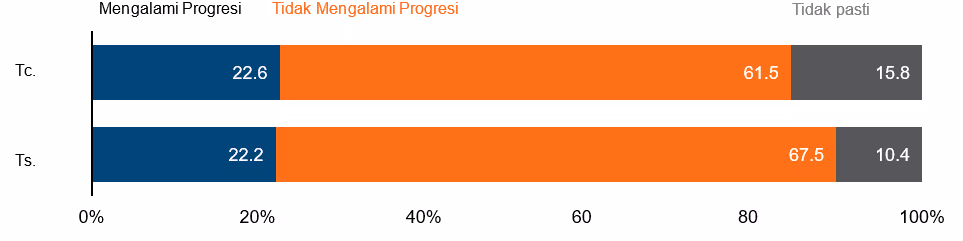 Namun, walaupun wujud persepsi ini, hanya sebahagian kecil daripada mereka yang memiliki pengiktirafan MBOT yang tinggi (Teknologis Profesional, Ts. dan Juruteknik Bertauliah, Tc.) mengalami penghargaan positif daripada majikan selepas menerima pengiktirafan yang lebih tinggi. Hanya satu per lima Teknologis Profesional (22.2%) dan Juruteknik Bertauliah (22.6%) mengalami kemajuan kerjaya, sama ada melalui kenaikan pangkat atau peningkatan gaji, selepas menerima pengiktirafan mereka (Rajah 4). Ini menekankan jurang antara pulangan yang dijangka daripada pengiktirafan profesional dan penggunaannya secara sebenar dalam proses membuat keputusan sumber manusia oleh majikan.