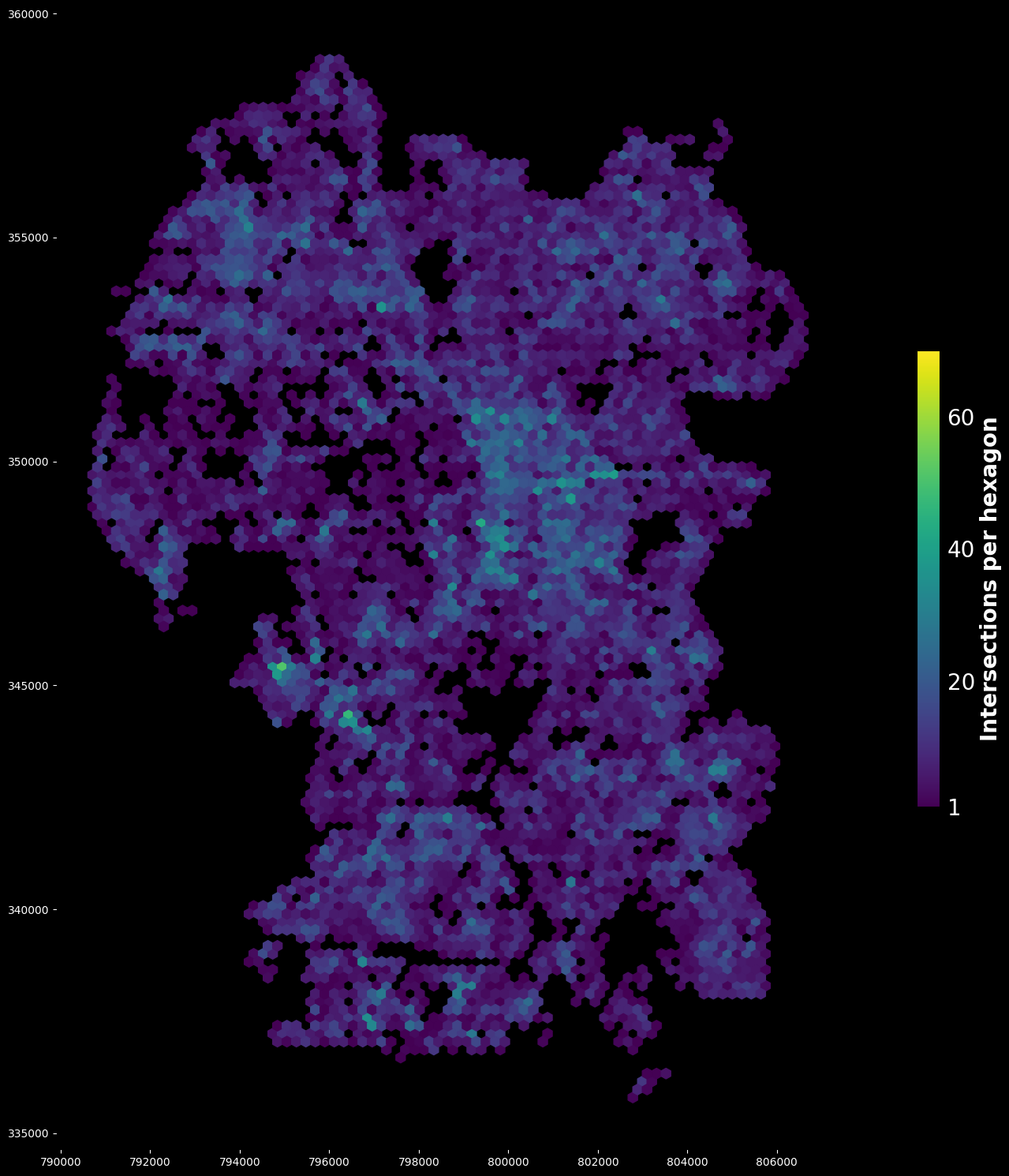 cb.set_label('Intersections per hexagon', fontsize=20, fontweight='bold')