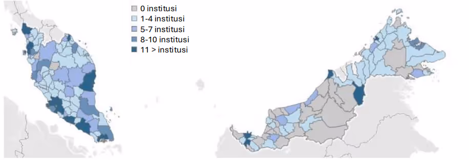 Bilangan daerah yang mempunyai institusi TVET tertiari adalah jauh lebih rendah (Rajah 2). Jurang ini amat ketara di Sabah dan Sarawak, di mana institusi TVET tertiari tertumpu di sekitar ibu negeri masing-masing, iaitu Kota Kinabalu (13 institusi tertiari) dan Kuching (18 institusi). Selain itu, Bintulu dan Miri di Sarawak, serta Sandakan di Sabah, masing-masing mempunyai lima institusi TVET tertiari, yang mungkin dipacu oleh tahap aktiviti perindustrian yang tinggi di kawasan tersebut.