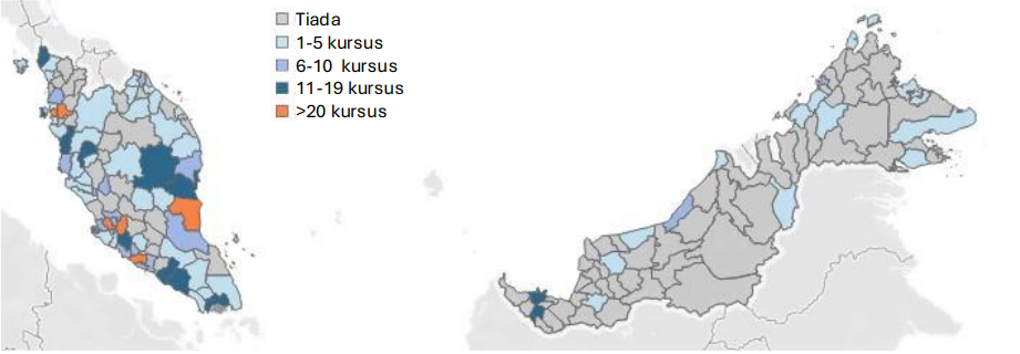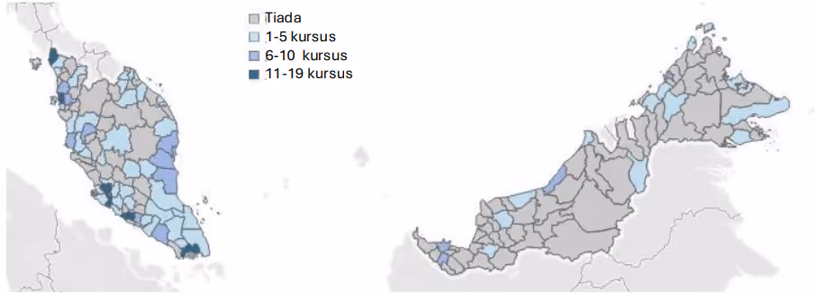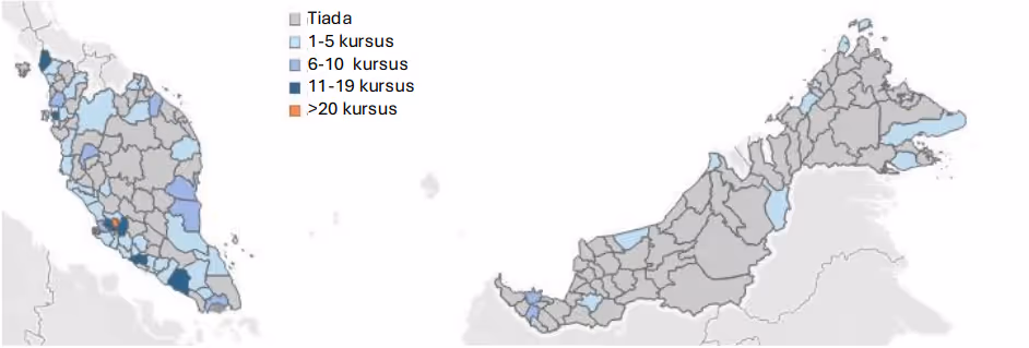 Sebaliknya, sebahagian besar kawasan luar bandar di Malaysia—terutamanya di wilayah tengah dan timur Semenanjung Malaysia serta sebahagian besar Sabah dan Sarawak—menunjukkan kewujudan kursus yang sangat sedikit atau langsung tiada. Ini mencerminkan corak pembangunan tidak seimbang yang lebih luas serta kekangan dalam ketersediaan TVET bertaraf tertiari di wilayah tersebut. Ketidakseimbangan ini boleh mengehadkan potensi pembangunan digital di wilayah lain, sedangkan kemahiran ICT semakin menjadi keperluan asas dalam hampir semua sektor pekerjaan.